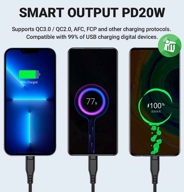 This UL-certified charger with built-in safeguards protect your devices against excessive current, overheating, and overcharging Smart output, support for PD20W, for QC3.0 / QC2.0, for AFC, for FCP and other charging protocols. Compatible with 99% USB charging digital devices.