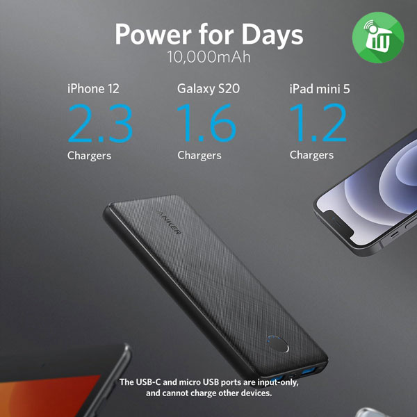 Power up your PowerCore 10K in just 5 hours with an 18W USB-C Power Delivery wall charger (not included). Recharging via a 10W USB-A charger and cable (not included) will take approximately 10 hours.