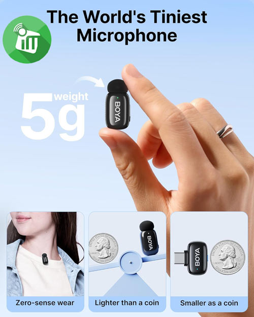 Meet BOYA mini, the world’s tiniest wireless microphone. Weighing only 5 g, its streamlined design fits seamlessly with your clothing, offering a weightless feel that makes it perfect for your recording anytime, anywhere. Capture sound naturally and discreetly