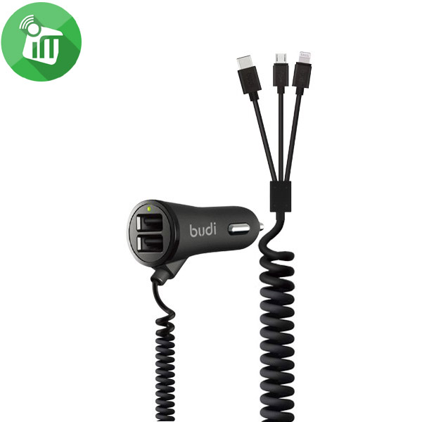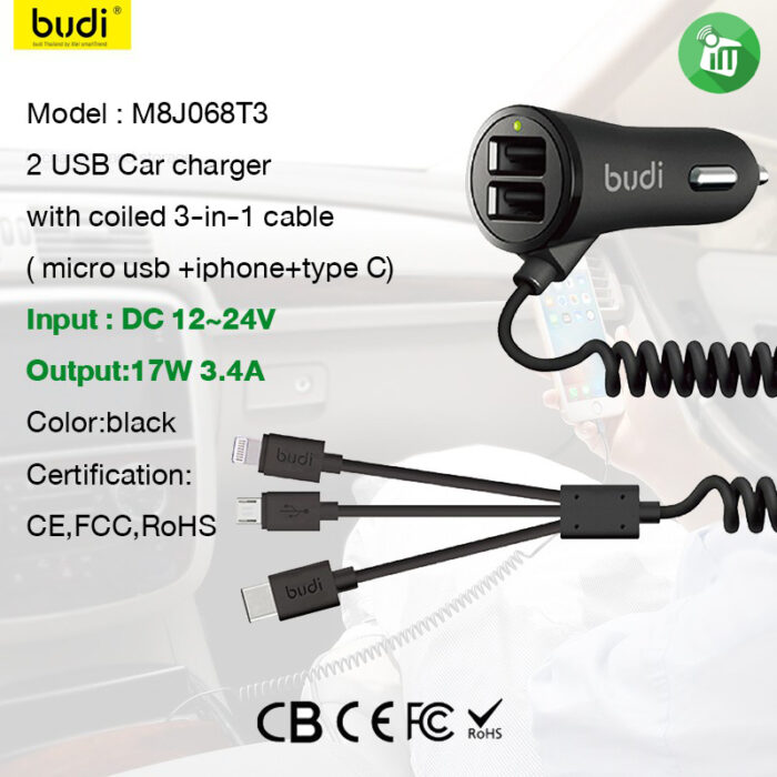 Budi M8J068T3 2 USB Car charger with coiled 3 IN 1 cable (2M)