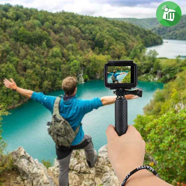 Extension selfie stick made of soft rubber grip; lightweight aluminum; non-slip handle and comfortable wrist strap to help you hold the stick and your action camera tightly and securely