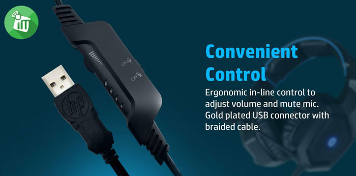 Ergonomic in-line control to adjust volume and mute mic. Gold plated USB connector with braided cable