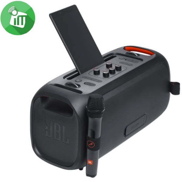 The JBL PartyBox On-The-Go Essential comes with a JBL wireless microphone with a range of up to 10 meters.