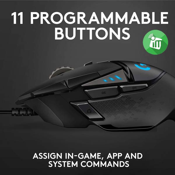G502 HERO features an advanced optical sensor for maximum tracking accuracy, customizable RGB lighting, custom game profiles, from 200 up to 25,600 DPI, and repositionable weights.