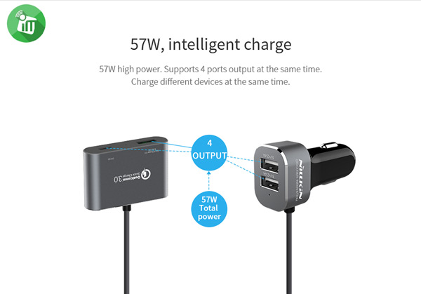 for both front & rear seat passengers as there are 4 ports in a single charger, hence essential for daily life and family trips The 2m extension wire makes sure the rear seats passengers can charge there devices wihtout problems too. Nillkin PowerShare fast car charger supports QC 3.0 fast charging. The Intelligent charge Chip with advance current management helps to identify different devices on every USB port to charge them with the right curren