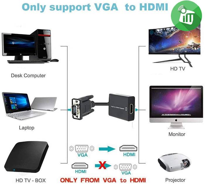 Imported super quality adapting chipset, converting and outputting VGA signal to HDMI display devices. This converter is NOT bi-directional, it is vga to hdmi adapter