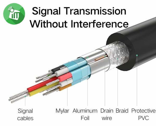 In addition, Gold-plated connectors, tinned copper conductors, and foil & braid shielding combine together to provide both superior cable performance and reliable connectivity. Gold-plated connectors provide durability, and improve the signal transmission; Foil & braid shielding reduces Electromagnetic interference; Tinned copper conductor enhances cable performance