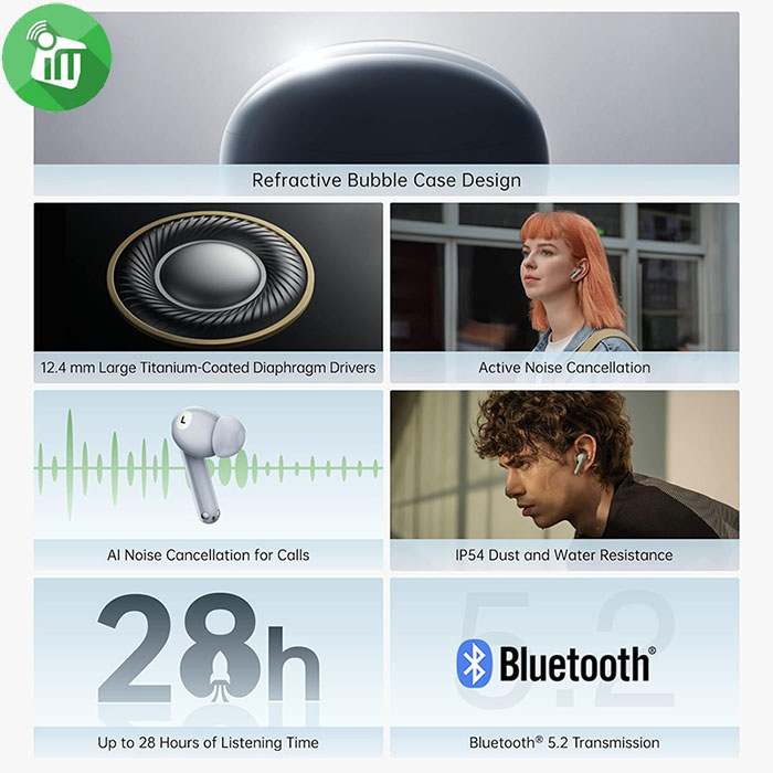 Refractive Bubble Case Design Thanks to a special diagonal structure design, the earbuds are compact despite having large diaphragm drivers. The ergonomic streamline design and the skin-friendly silicone ear tips, which come in three sizes, ensure a comfortable fit in your ear. In addition, the innovative refractive case looks translucent in the light, making it a perfect accessory.