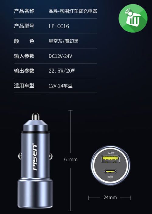 in addition, Pisen LP-CC16 PD Suitable for all types of cars/Compatible with Apple and Android phones This fast car charger adapter suitable for charging phones, tablets, power banks, video games controllers, sports watch, navigation, camera, mp3, etc.The PD Type C USB A car charger adapter compatible with your iPhone, iPad, Samsung Galaxy, LG, Google Pixel, etc.