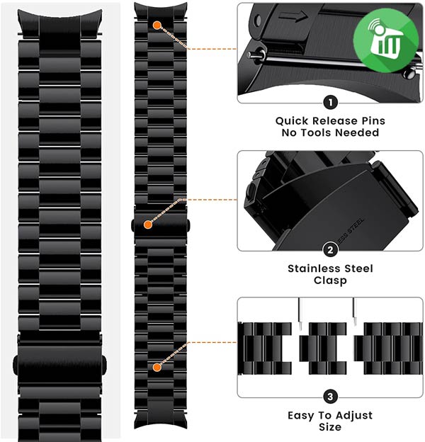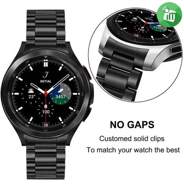 Stainless Band Galaxy Watch4 Made Of High Quality Stainless Steel, cut and spliced Partial metal solid with interlock clasp design, Compared to other stainless steel band this metal watch band has better comfortable and breathable, wearable and not fade, locks onto, precisely and securely For instance, The strap offers a soft, textured feel and is both sweat and water resistant.