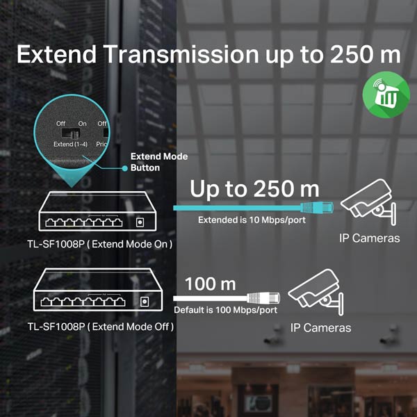 With extend mode, the PoE transmission distance reaches up to 250 m*—perfect for IP Camera deployment in large areas.