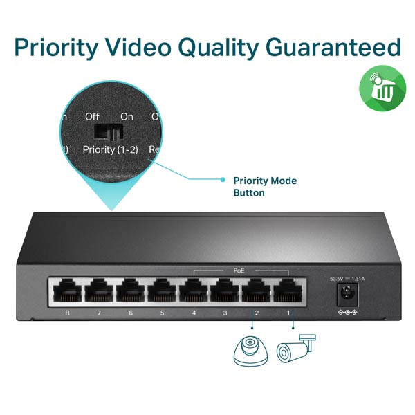 Quality of sensitive applications like video monitoring in critical business areas is guaranteed by offering higher priority options for ports 1–2 when one-touch Priority Mode is on.