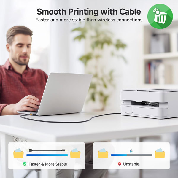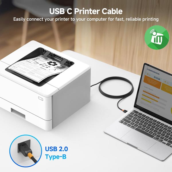 Crafted with a flexible cable and molded strain relief, this USB C printer cable is built to withstand frequent use. It features full shielding for superior transmission performance, minimizing EMI/RFI interference. The robust connectors click into place securely, providing a stable connection for reliable data transfer.