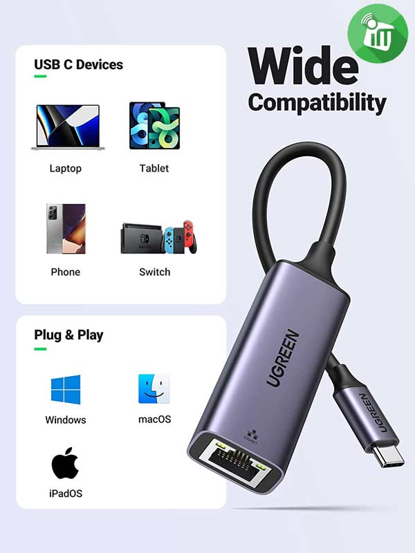 UGREEN 50737 USB-C Gigabit Network Adapter offers a convenient and inexpensive way to protect or replace the RJ45 LAN port of your laptop. Plus, the Type C Network Adaptor enables Non-RJ45 device like Chromebooks/iPad Pro/Android to use stable and speedy wired internet. Lightweight and compact size makes this USB Gigabit Ethernet Adapter a perfect companion for travel.