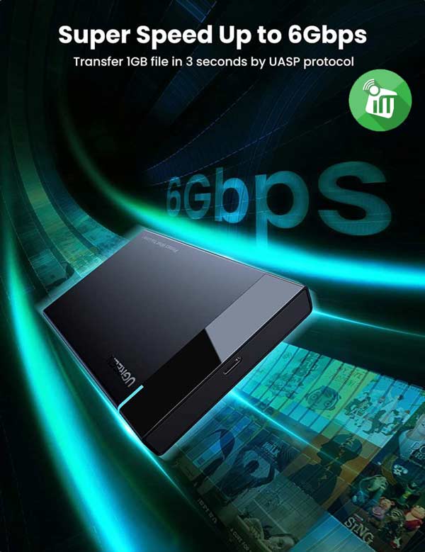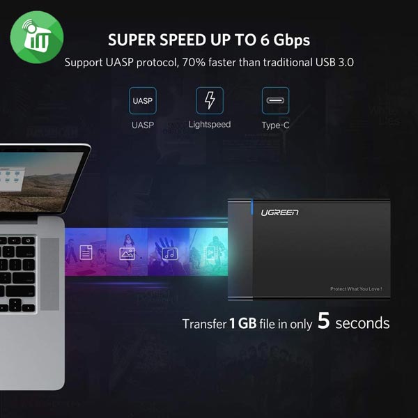 Enhanced with the UASP protocol, delivering up to 70% faster performance than conventional USB 3.0. The 6Gbps max speed makes you transfer 1GB file just in only 3 seconds.