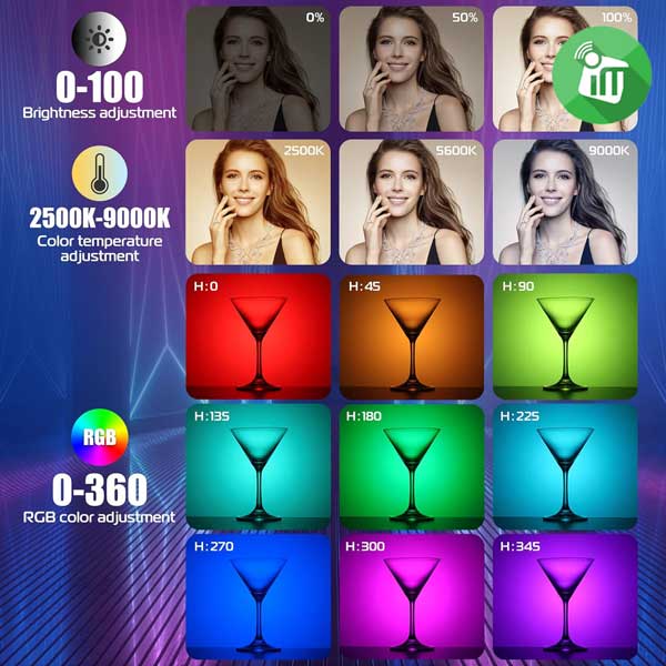 Offers complete 0–360° RGB color selection and adjustable bi-color temperature from 2500K to 9000K, suitable for a wide range of creative lighting scenarios.