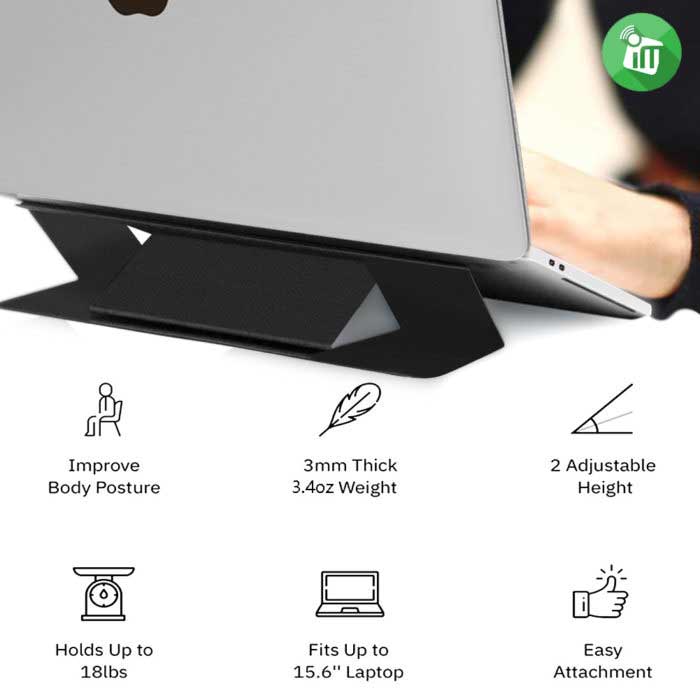 The stand is only 3mm thick and weighs only 2.3 ounces. There are two adjustable heights it can be set to and it will hold up to 18 pounds. The stand will work with laptops up to 15.6” in size and it has a strong adhesive built into the stand for easy installation