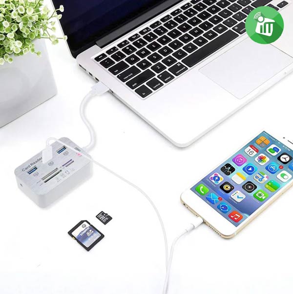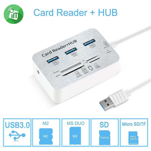 3 Ports USB 3.0 Hub + Card Reader for MS/MS PRO DUO, SD/MMC, M2, Micro SD(TF card)which allows you to transfer HD movies or files in just seconds.All ports can work together at the same time, easily transporting data from each card or connecting device.