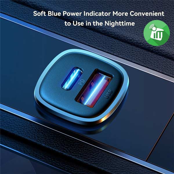 This car charger with QC3.0 and PD Type C dual fast charging ports. Supports simultaneous fast charging of two mobile devices.