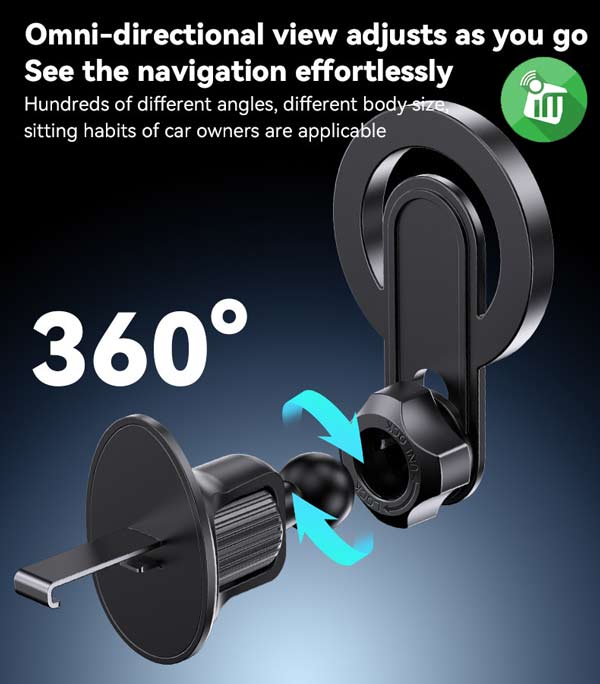 Integrated with 20 high-strength magnets, this car holder provides exceptionally powerful magnetic absorption. Fully compatible with MagSafe, it offers instant and secure attachment for iPhone 12 through 16 series. Non-MagSafe phones can also be used with the included magnetic ring.