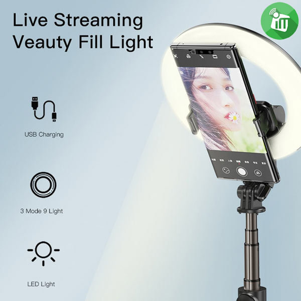 - Bluetooth remote control tripod selfie stick with ring fill light