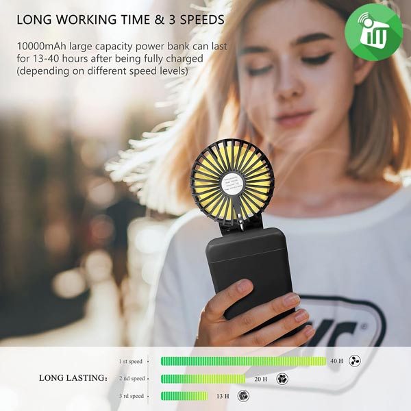 the hand fan can be charged via a USB cable (included). Works for 13-40 hours on a full charge. At the same time, the handheld fan has the function of a power bank, which can charge your mobile phone in an emergency